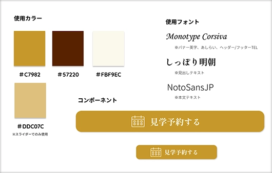 デザインの方向性と色味は指定があったため、その指定から、シンプル・高級感・白メインのベージュを中心に構成しました。